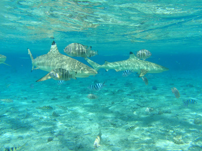 Auf Aitutaki machte ich mich zuerst auf die Jagd nach neuem Mückenschutz, da auch das Paradies leider nicht perfekt ist; die Mücken fanden mich günstigerweise weniger lecker, aber Annette war für die Biester unwiderstehlich. Irgendwie war in den ersten Geschäften nichts mehr zu haben, so daß ich etwas weiter gehen mußte. Auf dem Rückweg nahm mich dann netterweise ein Einheimischer auf dem Moped mit, was mir bei der Wärme sehr gelegen kam. Gleich am ersten Tag sahen wir aus der Ferne ein Kreuzfahrtschiff und, romantische Frauenträume wurden wahr, es wurde am Strand geheiratet. Der nächste Tag wurde sehr erlebnisreich. Am Morgen fuhren wir mit dem Boot durch türkisfarbenes Wasser hinaus auf die Insel One Foot Island. - Diese nette kleine Insel hat von oben gesehen die Form eines Fußes; man umrundet sie ruhigen Fußes in etwa 15 Minuten. One Foot Island weist aber noch eine große Besonderheit auf. Im Post Office kann man sich gegen Gebühr einen Stempel in den Reisepaß drücken lassen; es gibt wohl kaum nettere Andenken. Der Abend wurde auch sehr interessant, denn die Island Show fand statt. Dabei demonstrierte die örtliche Rugby-Mannschaft einige Tänze. Die Kriegstänze wirkten besonders gut wegen der athletischen Statur der Tänzer. Gegen Ende der Show wurden dann noch Tänze mit Fackeln gezeigt, was auch sehr eindrucksvoll war. Leider verging die Zeit auch auf Aitutaki viel zu schnell und es ging wieder mit dem Flieger zurück nach Rarotonga, um von dort aus vie Papeete nach Bora Bora zu gelangen. Die erste Besonderheit auf Bora Bora, das zu Französisch Polynesien gehört, war für uns die Landung auf einer kleinen Vorinsel, Motu genannt. Diesmal wurden wir nicht mit dem Taxi abgeholt, sondern mit dem hoteleigenen Boot. Am Folgetag erkundeten wir ein wenig das Umfeld des Hotels fest. Dabei konnten wir die Preise für Lebensmittel im Supermarkt bewundern (Frankreich + Inselzuschlag XXL); eine 1Liter-Flasche stilles Wasser kostete umgerechnet 1,28€, das 750g-Glas Nutella lag zwischen 7 und 8€, aber Baguettes gab es für 70 Cent das Stück. Bei einer Inselumrundung mit Hai- und Rochenfütterung sahen wir nicht nur das Wahrzeichen von Bora Bora, den Berg Mont Otemanu, sondern auch Haie und Rochen aus allernächster Nähe. - Es fühlt sich merkwürdig an, wenn einem ein Rochen am Rücken hängt und mit den Flügeln schlägt; die dunkle Oberseite fühlt sich rauh an, die helle Unterseite ist glatt. Leider mußten wir schon wieder zu zeitig in den Flieger, um nach Papeete zu gelangen. Angekommen in der Hauptstadt Tahitis sahen wir beim ersten Blick vom Hotel-Balkon auf den Lafayette Beach schwarz, genauer gesagt schwarzen Sand. - Dieser Sand glitzert ganz eigenartig und ist sehr fein, er dringt durch den Stoff der Badesachen und findet sich noch lange nach dem Duschen in den Ohren oder im Taschentuch an. Dort